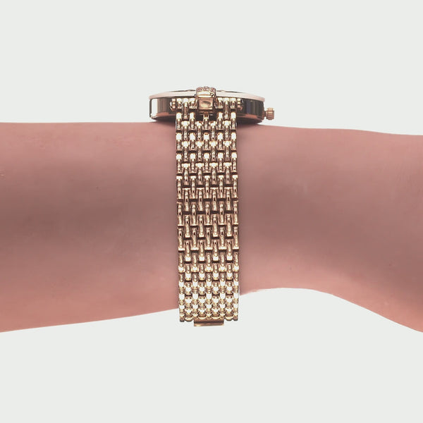 Die glamouröse Schweizer Frauen Armbanduhr mit ihrem feinen 30mm Durchmesser kombiniert das golden schimmernde Ziffernblatt im Sonnenschliff mit glitzernden Strass-Steinen und einem edlen goldfarbenen Meshband. Das exquisite Modehighlight schenkt dir deinen unverwechselbaren Look und bewundernde Blicke deiner Freunde