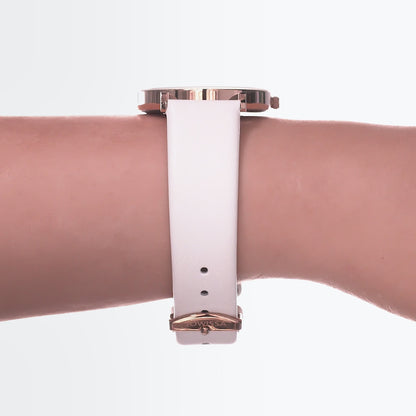 Die Schweizer Damenuhr ist ein echtes Schmuckstück in Schneeweiss: Die glitzernde Flachfacette umspielt das weiblich runde Gehäuse in edler Rosévergoldung und elegantem 35mm Durchmesser. Das schimmernde Emaille-Zifferblatt und das feine Echtlederband schenken dir entspannte Lässigkeit in deinem minimalistischen Style
