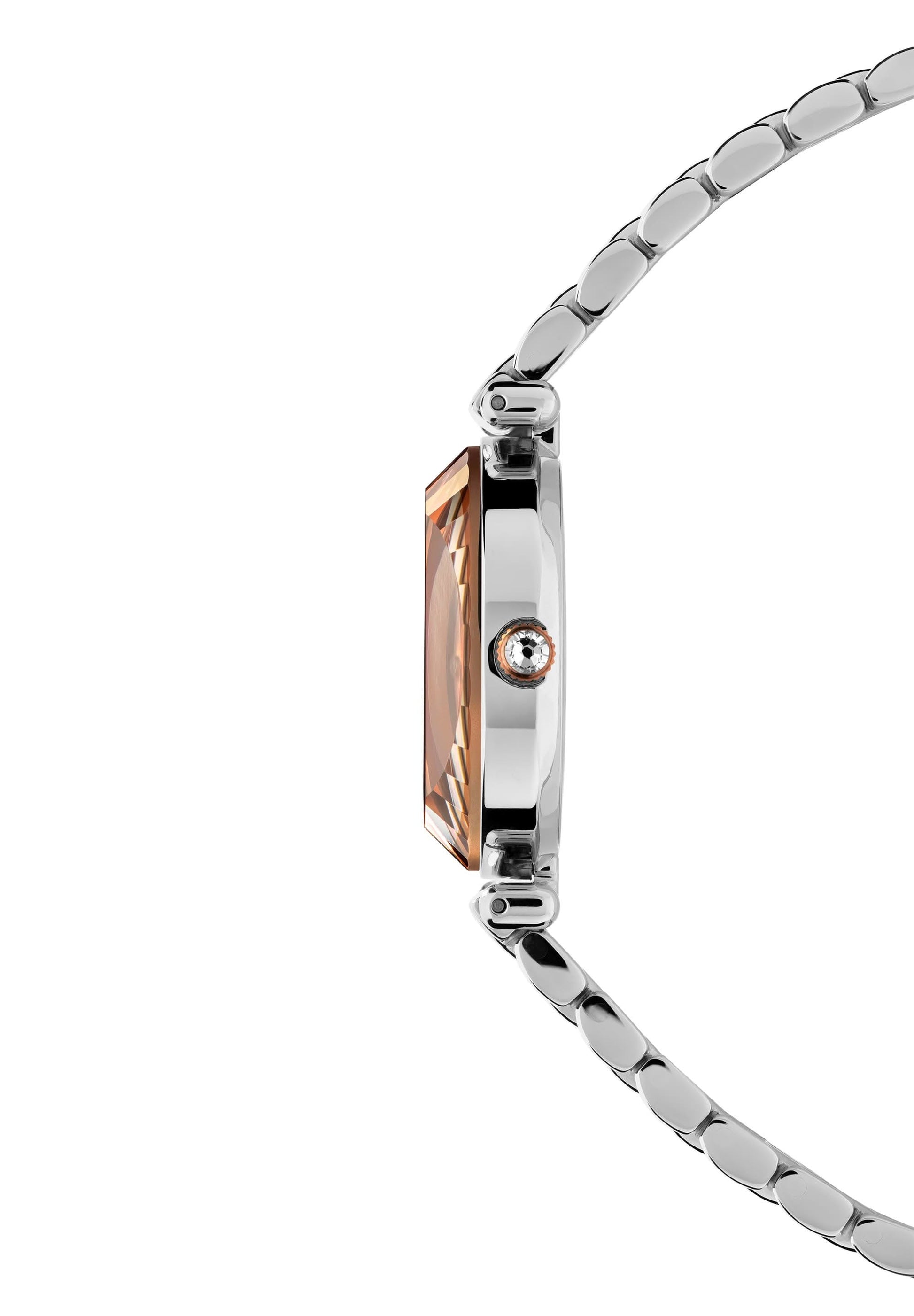 Diese in der Schweiz hergestellte Damenuhr besticht durch ihr silberfarbenes und roségoldenes Degradé-Zifferblatt, das einen modernen, dynamischen Look erzeugt, der durch roségoldene Zeiger und 12 strassbesetzte Indizes noch verstärkt wird. Das 27mm Edelstahlgehäuse ist mit einem schönen Glas mit Diamantschliff versehen. Ein stilvolles, zweifarbiges Milanese-Armband und eine Wasserdichtigkeit von 5 ATM vervollständigen die trendige Eleganz dieses Zeitmessers.