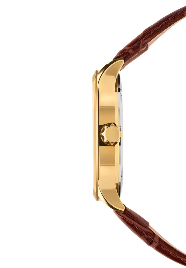 Die Schweizer Uhr für Männer ist mit ihrem grossen 38mm Durchmesser ein auffallender Blickfang an deinem Handgelenk: Das präzise Quarzwerk verspricht dir exakte Zeitmessung. Das silberne Ziffernblatt im reflektierenden Sonnenschliff mit feinem Goldschimmer in Indizes und Lunette wirkt stilvoll zu dem braunen Lederband