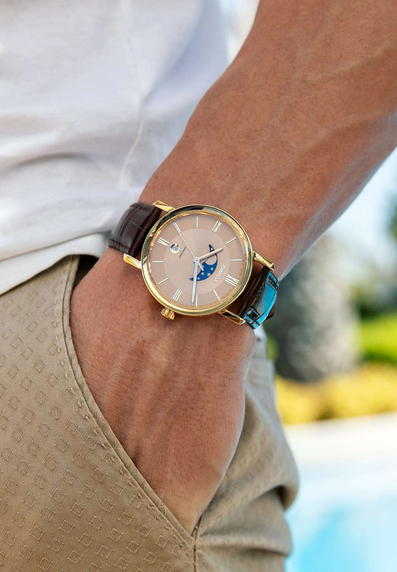Waterproof, Quartz movement, Date display, Interchangeable strap, Moon phase display, Moon phase clock, Swiss made, and Analogue wristwatch