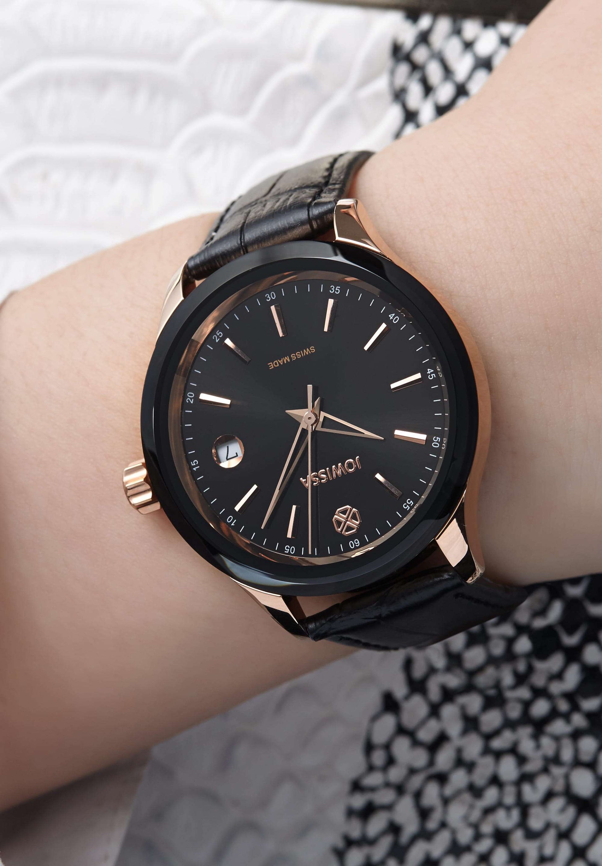 Waterproof, Quartz movement, Date display, Interchangeable strap, Analogue wristwatch, and Swiss made
