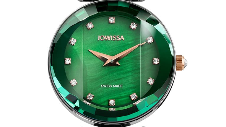 Enjoy the clear beauty of the "Crystal Essence" collection, a celebration of clarity and refined style. These Swiss Made timepieces capture elegance, illuminating every moment with a sparkling touch. This heartfelt collection features four distinct dials. Choose the ethereal glow of genuine green or white mother of pearl, the captivating depth of a blue sunray dial, or the mesmerizing degradé effect, where silver seamlessly blends into rose-gold. Each 27mm stainless steel case, just 8mm in height, is crowned with a facetted glass featuring a delicate diamond cut, catching light with every wrist turn. Twelve rhinestone indices sparkle on the dial, adding a touch of brilliance. The fine Milanese bicolor stainless steel bracelet provides a comfortable and stylish fit. Crafted with precision, these 5 ATM water-resistant watches are as reliable as they are beautiful. Crystal Essence embodies the pure, sparkling spirit of time - small, Swiss Made treasures meant to be loved.