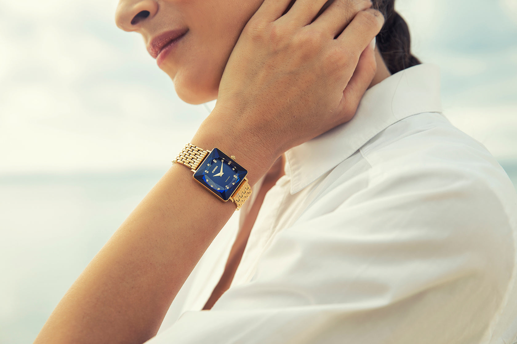 The glamorous Facet Princess collection of women’s watches is inspired by the beautiful princess cut diamond. It gives the crystal incredible jewelry sparkle. Exciting color variations and strong lines define the look of each watch. The distinctive square watch face has rounded corners to bring a smooth finish to each corner. Square and round shapes unite to create a visually stunning effect – the classic round dial sits within the 25mm square case. Jewelry influences are continued on the dial. Glittering gemstones are used as hour markers to add bright sparkle to the design. Color choices are rich and varied. Dials stand out in emerald green, deep blue, classic black or a rich burgundy and the square case is paired with either a glossy genuine leather band or a shiny stainless steel bracelet. If you want to explore an alternative to the classic round timepiece, our Facet Princess square face watches with Swiss quartz movement are the perfect choice.