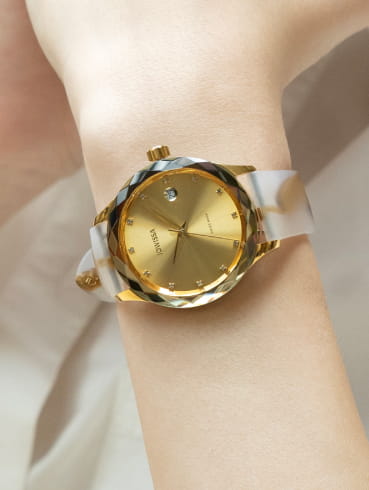 Bring shine and brilliance to the hour with Tiro. This ladies’ watch is designed to keep you on time and looking fabulous. The 38 mm case is the perfect setting for extra detail such as glittering rhinestones on the sunray dial. The faceted glass also attracts the light to make a sparkling statement on your wrist. Three hands are highlighted in golden detail while a date window makes a neat appearance. This Swiss-made timepiece is styled with a polished gold bracelet or a high-shine patent leather strap in strong colours such as rich chocolate, sleek black and vibrant shades of red. Dial and strap variations also allow you to wear the look you love. Whether it is about bold contrast or a more co-ordinated vibe, Tiro defines a women’s watch that exudes glamour and high-end style.
