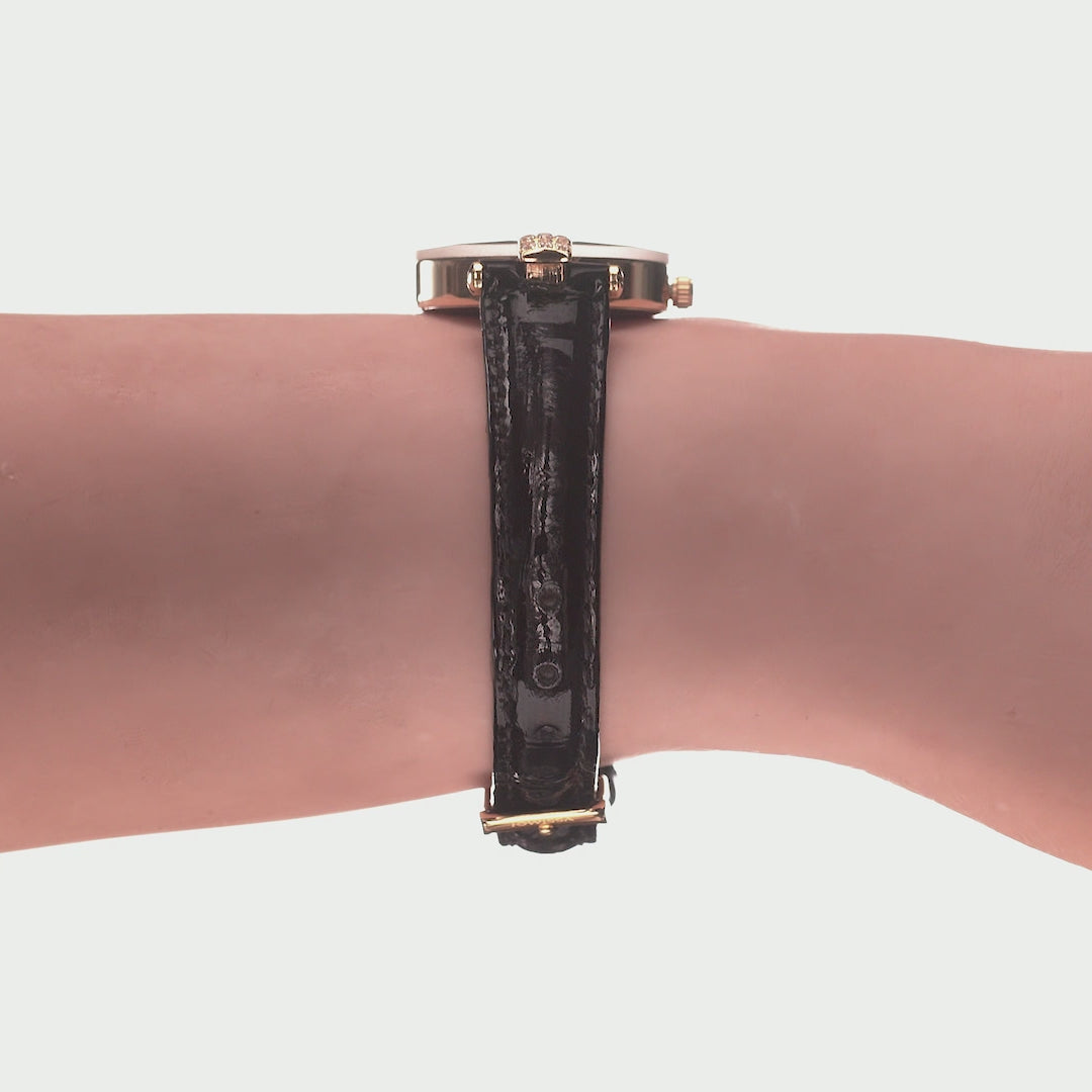 Diamond Cut Cocktail Watch for Women Gold Dial Black Leather Band 25mm