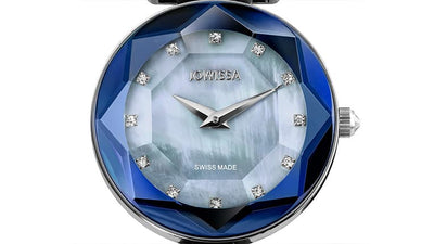 Das Herzstück jeder Uhr ist ein weisses, grünes oder blaues Perlmutt Zifferblatt, das in einem himmlischen Glanz erstrahlt. Das 27mm Edelstahlgehäuse mit einem schlanken 8mm Profil ist mit 12 glitzernden Strasssteinindexen verziert, die für einen Hauch von Luxus sorgen. Das Highlight der Crystal Radiance ist ihr diamantgeschliffenes, facettiertes Glas, welches das Licht perfekt einfängt und reflektiert.