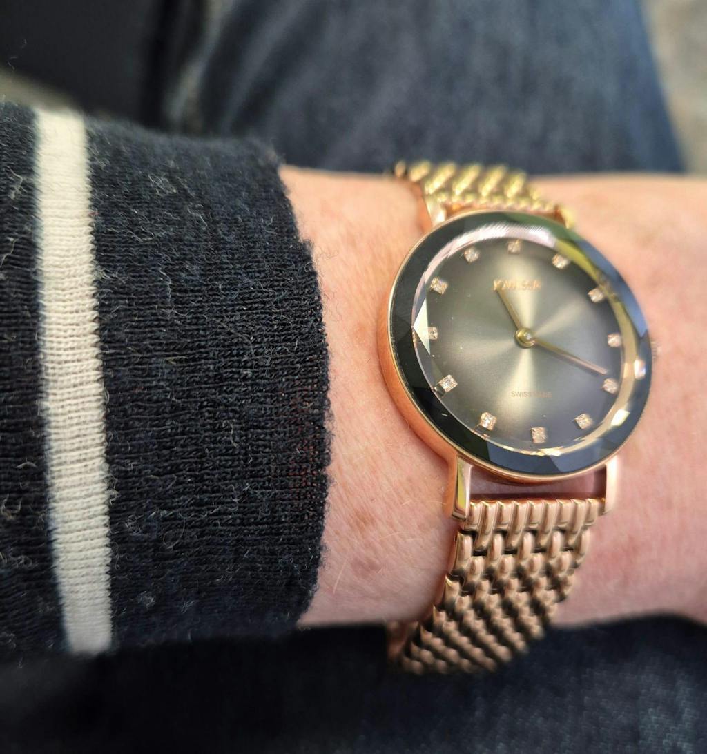 Waterproof, Quartz movement, Interchangeable strap, Swiss made, and Analogue wristwatch