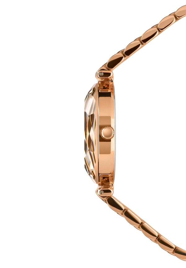 Rose gold watches for women are given a style upgrade in the Facet Brilliant collection. This ladies wristwatch stands out with its burgundy dial and its two sparkling gemstones made of Cubic Zirconia. Measuring 30mm in diameter, it is elegantly sized for everyday wear. The watch crystal is a celebration of the round brilliant cut diamond for jewelry lovers everywhere.