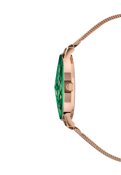 Transform your wrist with this green watch for women that glitters and catches the light. Extra sparkle is added with a 30mm wide diamond-cut faceted crystal on top of a green mother of pearl dial detailed with rhinestones. The rose-gold bracelet looks good next to the blue and adds jewel-like style to a reliable timepiece.